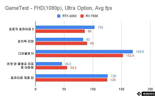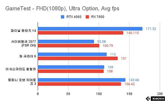 그렇다고 해서 압도적이라고 이야기 하기에는 큰 차이가 나지 않는 경우가 많았고, 오히려 RX 7600이 더 높은 성능을 제공하는 게임들도 분명히 존재했다.