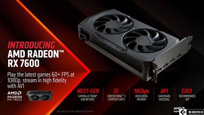 먼저 라데온 RX 7600은 전세대 라데온 RX 6600에 비해 50%이상 개선된 전성비가 화제가 되었다. 특히 부족하다 여겨졌던 RT 관련 성능이 상당히 상승했으며 AI 가속기도 추가되어 더욱 완성도가 높아진 메인스트림 그래픽카드로 이야기되고 있다.