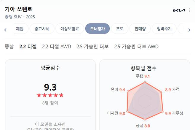 실제 차주들의 평가를 기반으로 차량 만족도 점수를 공개하는 ‘네이버 마이카 오너평가’에 따르면 기아 쏘렌토 2.2 디젤의 오너평가 점수는 9.3점을 받았다.