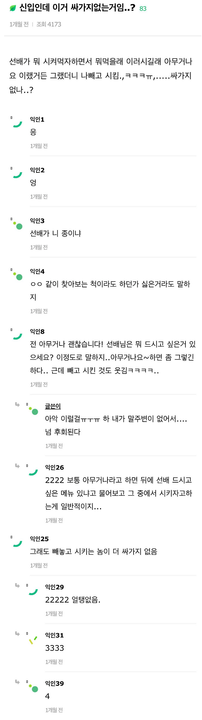 신입이 말재주가 끔찍할만큼 없긴 하지만 선배도 이상한 사람이네..