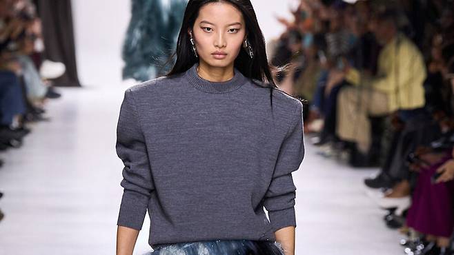 보테가 베네타 2026 S/S 컬렉션 제품으로, 겉보기에는 단정한 기본 니트처럼 보이지만 어깨 라인에 힘을 실어주는 파워 숄더가 핵심이다.