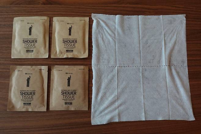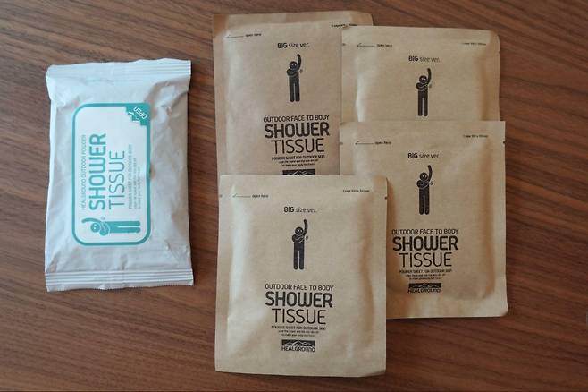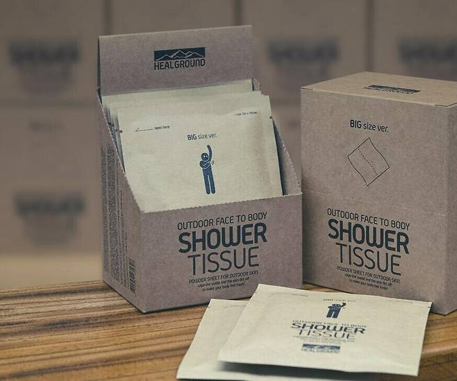 땀과 냄새를 동시에 빨리 제거하는 비책을 찾다 ‘데오드란트 파우더 티슈’라는 제품을 발견했다. 물티슈에 땀띠를 제거하는 베이비파우더를 결합한 형태의 제품이다. 아웃도어 화장품 브랜드 ‘힐그라운드’에서 만들었다. 일주일간 티슈 한 장을 낱개로 포장한 빅 샤워 티슈와 물티슈처럼 뽑아 쓰는 샤워 티슈 2종을 써봤다. 절체절명의 순간에 주변인에게 티슈를 건네주기도 했다. 사실 확인이 필요한 부분은 이인복 힐그라운드 대표에게 취재했다.
