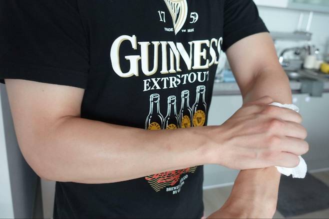 또 궁금해하는 부분은 일반 물티슈와의 차이점일 것이다. 비교를 위해 마트에서 저렴하게 판매되는 물티슈로 왼팔을, 파우더 티슈로 오른팔을 닦아봤다. 가장 직관적인 차이는 티슈 한 장이 머금고 있는 수분감이다. 일반 물티슈보다 파우더 티슈가 월등히 촉촉하다. 원단의 두께가 두꺼운 만큼 더 많은 수분을 머금을 수 있기 때문인 것으로 판단된다.