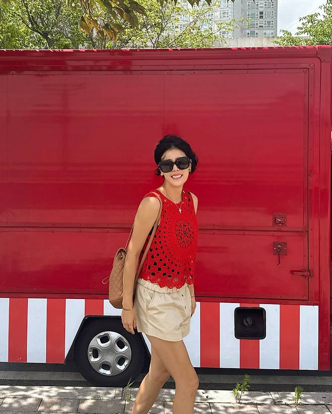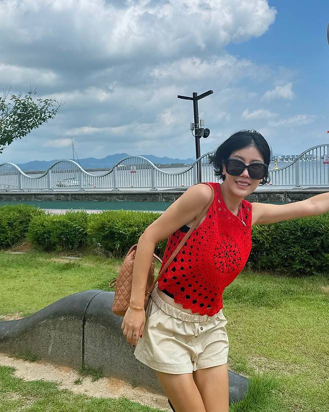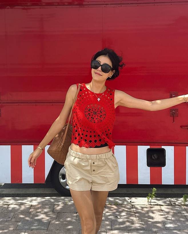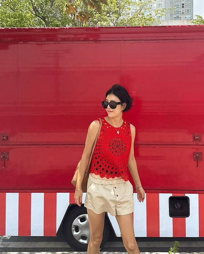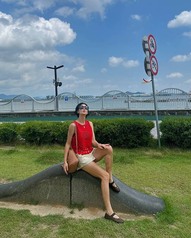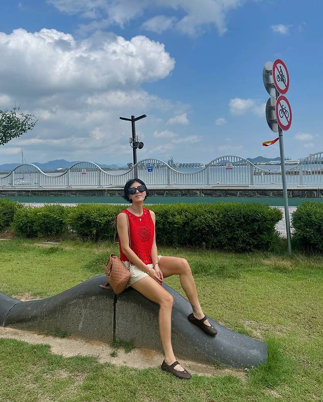 햇살이 강하게 내리쬐는 오후, 한정원은 뜨개질된 빨간 민소매 톱과 크림 컬러의 셔링 쇼츠로 가벼운 여름을 입었어요.