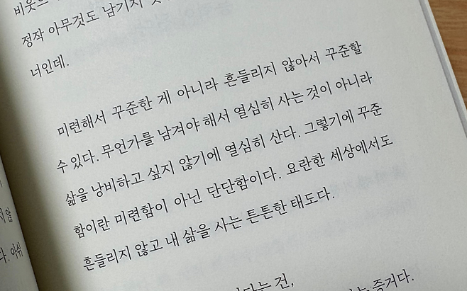 책 『어른의 행복은 조용하다』에서는 이렇게 말한다. “미련해서 꾸준한 게 아니라 흔들리지 않아서 꾸준할 수 있다.” 꾸준함은 재능이 아니라 중심 잡힌 마음에서 나온다. 중심이 없는 사람은 사소한 감정 변화에도 쉽게 무너진다.