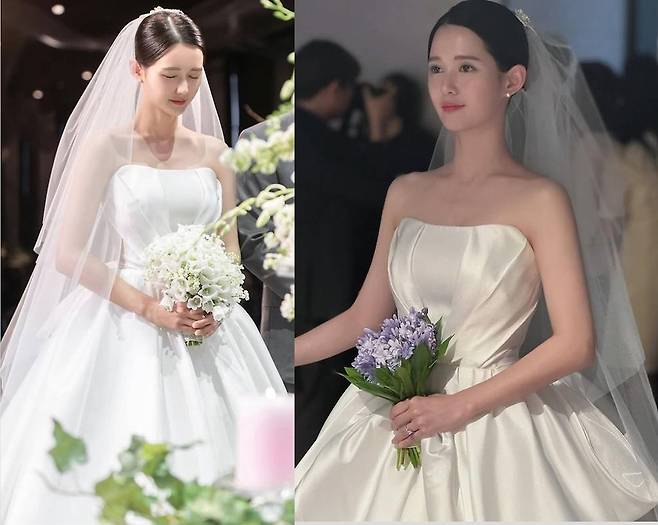 남보라는 군더더기 없이 단아한 실루엣의 스트랩리스 웨딩드레스를 착용해 우아한 분위기를 자아냈습니다.