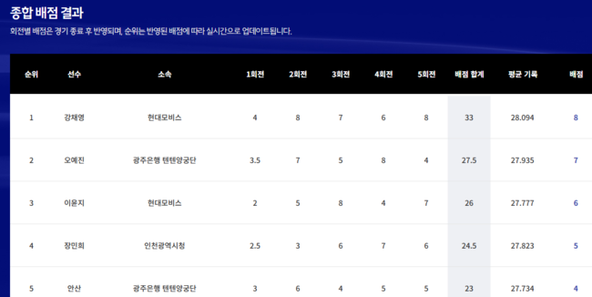 여기에 2020 도쿄 올림픽 3관왕 안산(광주은행)도 최종 평가전에서 4위 밖으로 밀리며 아시안게임 티켓을 놓쳤다. 세계랭킹 1위 강채영(현대모비스)이 1위를 지켜냈고, 오예진(광주은행)과 이윤지(현대모비스)가 2, 3위를 차지했다.