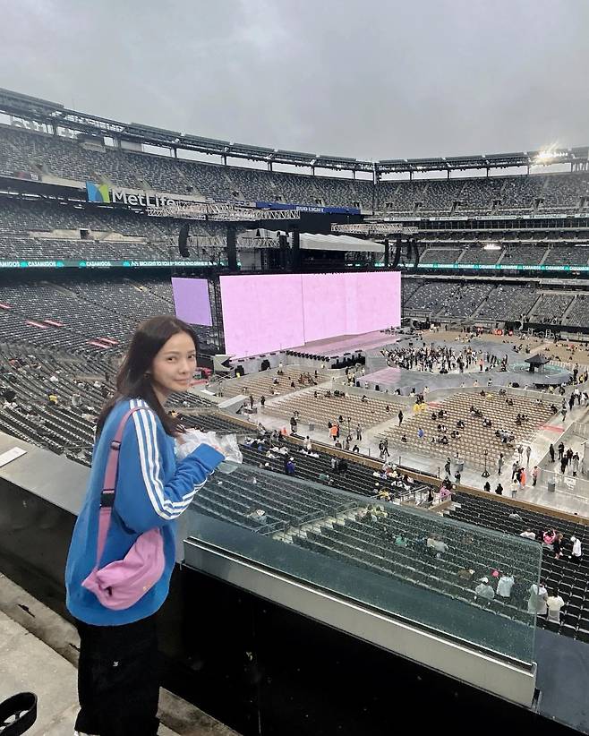 대형 스타디움에서 손태영이 블루 트랙 재킷과 블랙 팬츠의 스포티한 앙상블을 선보이고 있다. 아디다스 특유의 삼선 디테일이 돋보이는 재킷은 캐주얼하면서도 트렌디한 무드를 자아내고 있다. 핑크 컬러의 크로스백으로 포인트를 주어 전체적인 룩에 생기를 불어넣었다. 대형 공연장의 스케일과 어우러진 실용적이면서도 스타일리시한 관람룩으로 편안함과 패션 감각을 동시에 표현하고 있다.