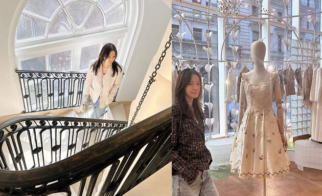 고급스러운 부티크에서 손태영이 블랙 체크 패턴의 오버사이즈 재킷을 착용하고 있다. 클래식한 패턴의 재킷과 캐주얼한 데님 팬츠의 믹스매치 스타일링으로 세련된 분위기를 연출하고 있다. 특히 블루 계열의 미니백을 매치해 포인트를 주었으며, 배경의 화이트 드레스와 대비되는 모던한 룩을 완성했다. 럭셔리 브랜드 쇼룸에서도 자신만의 스타일을 잃지 않는 패션 센스가 돋보인다.