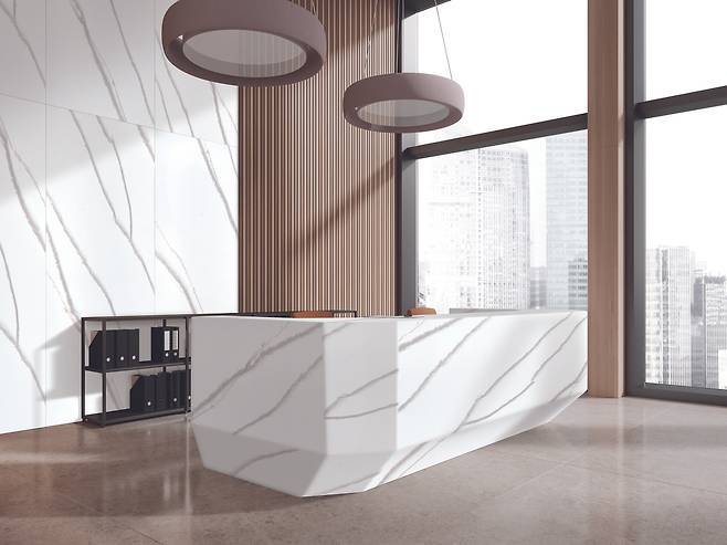 현대L&C는 하넥스 신제품으로 천연 대리석 질감을 정교하게 구현한 ‘칼라카타 베인’(사진) 패턴 2종을 선보였다. 이와 함께 재활용 원료를 활용한 칩 제품 ‘어반 샤드’를 함께 출시했다.