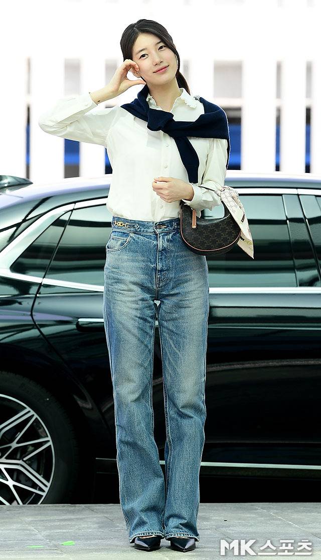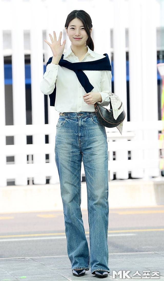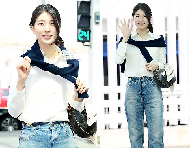 화이트 셔츠에 진청 스트레이트 데님을 매치해 베이직하면서도 깔끔한 룩을 완성한 수지는 어깨에 네이비 컬러의 니트를 가볍게 걸쳐 은근한 프레피 무드를 더했습니다.