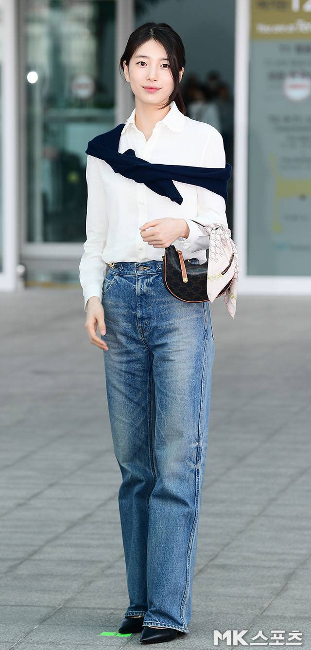 화이트 셔츠에 진청 스트레이트 데님을 매치해 베이직하면서도 깔끔한 룩을 완성한 수지는 어깨에 네이비 컬러의 니트를 가볍게 걸쳐 은근한 프레피 무드를 더했습니다.
