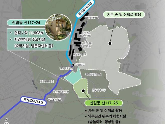 전체 면적 21만㎡가 넘는 구역에 숲 속의 집, 방문자센터, 산림체험시설 등이 순차적으로 들어서며, 관악구는 이를 ‘힐링·정원도시’ 전략의 핵심 거점으로 육성할 계획이다.
