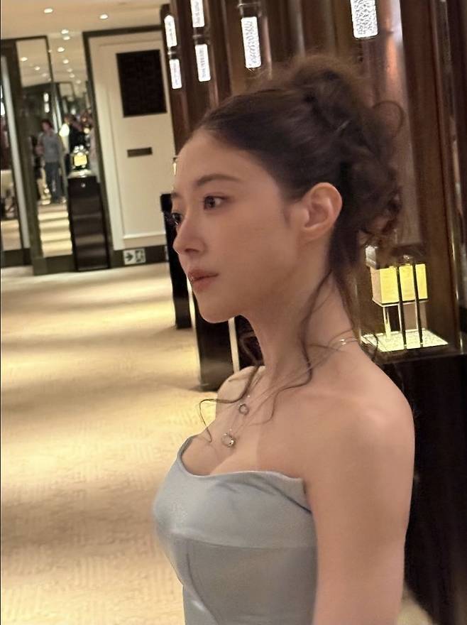 이세영은 앞머리 라인부터 뒤쪽까지 촘촘하게 올린 업두 헤어스타일로 머리 전체를 둘렀고, 귀 옆과 목선을 따라 몇 가닥만 고의로 빼놓은 컬이 자연스럽게 흘러내리면서 얼굴형을 부드럽게 감쌌습니다.