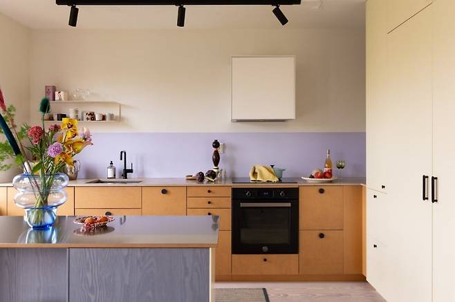 라벤더 컬러 타일과 파스텔 옐로 백스플래시, 그리고 메이플 우드 하부장이 만나 따뜻하면서도 세련된 분위기를 연출하죠.