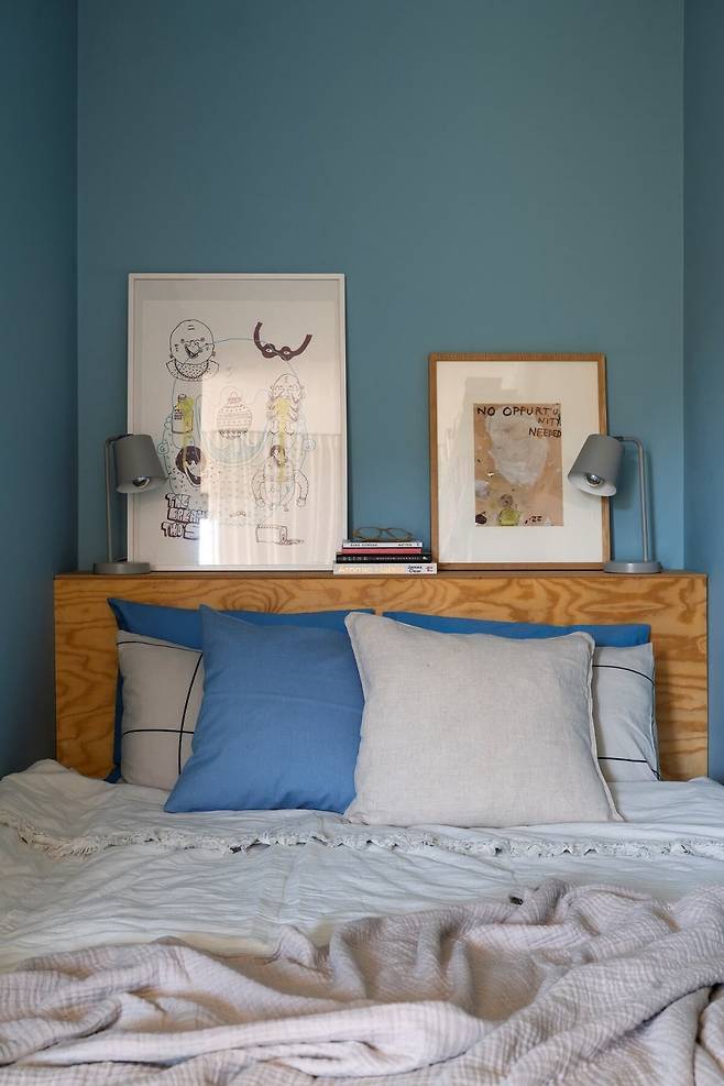 마지막으로 작은방은 블루 벽과 원목 헤드보드, 위트 있는 포스터로 개성을 더했습니다.