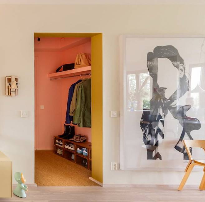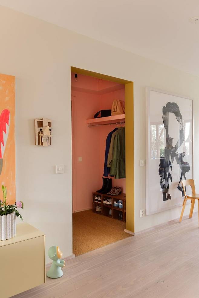 26평 아파트 현관꾸미기의 특별한 점은 바로 핑크색 벽면에 설치한 행거예요.
