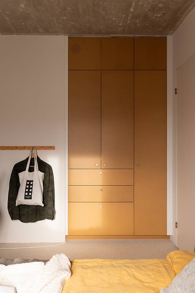 침대 옆쪽 벽면엔 겨자색 컬러의 붙박이장이 위치해 있어요.