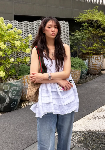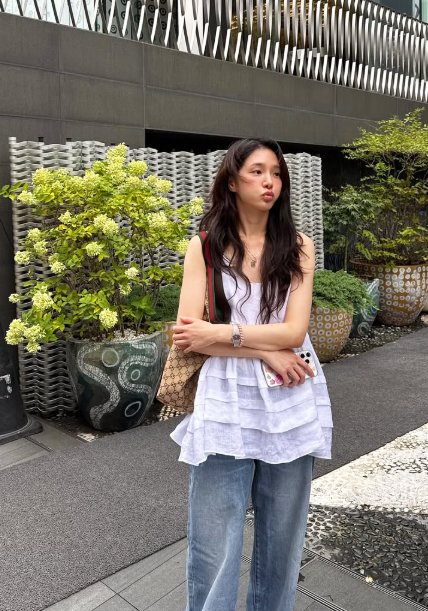 화이트 민소매 러플 블라우스와 와이드한 데님 팬츠의 조합은 클래식하면서도 캐주얼한 무드를 자아낸다.