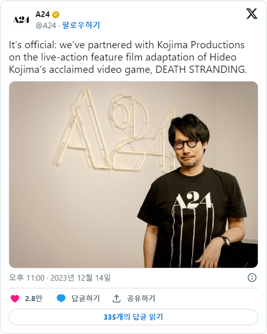 2019년 출시된 코지마 히데오 감독의 명작 데스 스트랜딩의 실사 영화를 A24에서 제작한다.