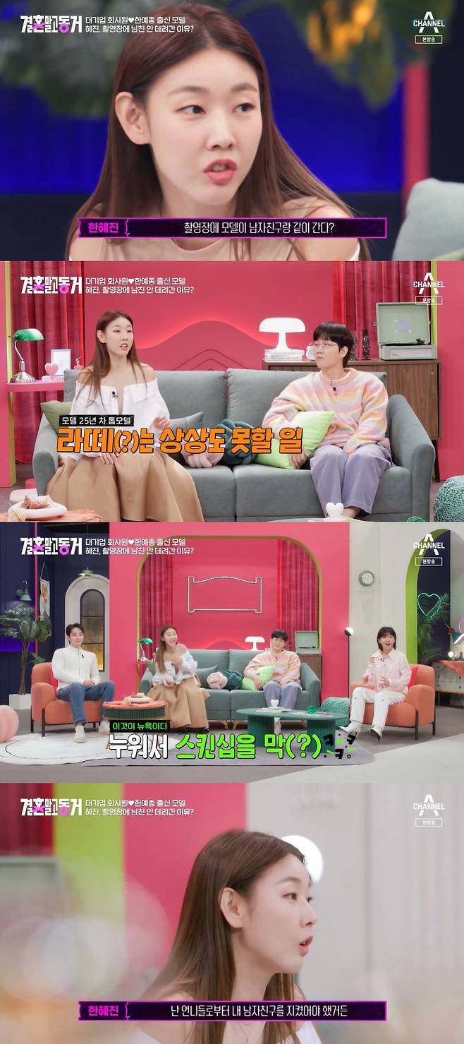 한혜진은 "촬영장에 모델이 남자친구랑 같이 간다? 저 어렸을 때는 상상도 못한 일이다. 한국에서 7년을 활동하고, 뉴욕에 갔더니 데려온 수준이 아니라 스킨십을 하더라. 뭐지, 저것들? 했다"며 한혜진도 남자친구를 촬영장에 데려온 적 있었냐는 질문에는 "난 없지"라며 재빠르게 대답했다.