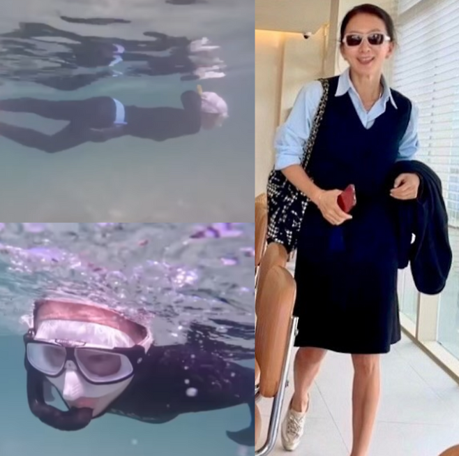 50대라는 사실이 믿기지 않을 정도로 탄탄한 바디라인을 자랑하며 나이를 초월한 고급스러운 분위기를 발산했어요. 스쿠버 다이빙을 즐기면서도 흐트러짐 없는 포즈와 차분한 표정이 더욱 멋스러웠죠.