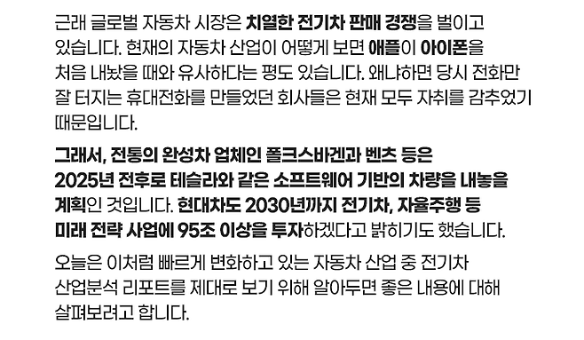 2050년까지 탄소중립을 선언한 많은 국가들은 교통수단의 친환경화를 단계적으로 이루어야 합니다. 그래서, 대부분 국가들이 2030~2035년을 기점으로 내연기관 판매 중단을 선언함에 따라 완성차 업체들은 이제 적극적으로 친환경차 라인업, 즉 전기차로의 전환을 모색하고 있습니다.