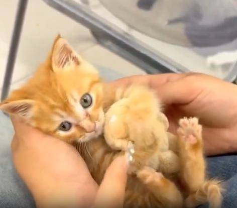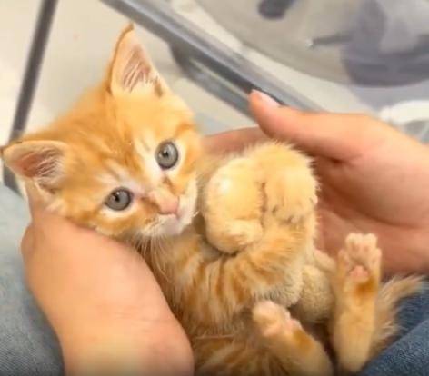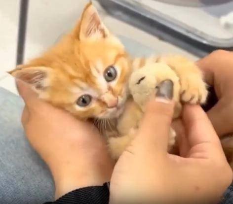 작은 손 안에 포옥 안긴 새끼 고양이. 아기 같은 얼굴엔 순진한 호기심과 조심스러운 경계가 동시에 담겨 있다. 그런데 고양이의 두 앞발엔 무언가를 단단히 끌어안고 있다. 그것은 다름 아닌 조그마한 곰인형. 마치 고양이보다 조금 더 작은 이 인형은, 새끼 고양이에게 있어 단순한 장난감을 넘어서 '무언가 더 특별한 존재'처럼 보인다.