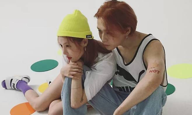 18일 현아의 계정에는 전 남자친구 던과 함께 찍은 커플 사진이 일부 남아있다. 사진 속 현아는 던의 무릎에 기대 포즈를 취하고 있다.