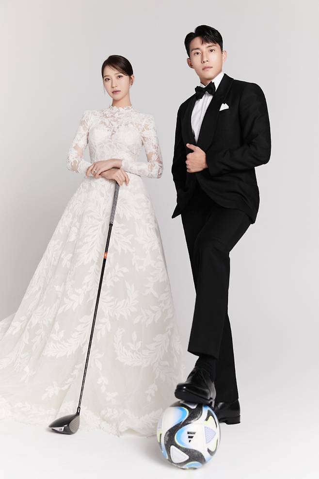 방송인 이혜지와 인천 유나이티드 미드필더 신진호가 웨딩화보속 웨딩룩을 선보였다.