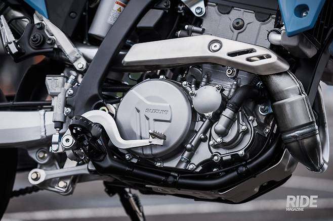 엔진은 398cc 단기통 수랭 방식으로 이전과 동일해보이지만, 적잖은 부분이 바뀌어 새 엔진으로 봐도 무방할 정도다. 흡기밸브는 티타늄으로, 배기 밸브는 중앙을 비우고 나트륨을 충전했으며, 캠 프로파일과 피스톤 등도 새롭게 설계했다. 실린더 헤드 또한 새로 개발했는데 여기에 트윈 스파크 플러그로 연소 효율을 높였으며, 크랭크 케이스와 클러치 어시스트 기능을 더한 슬리퍼 클러치도 기존에서 달라진 부분이다. 또한 에어박스와 배기 시스템 등을 더해 전 회전영역에 걸쳐 고르면서 강력한 성능을 내면서도 부드러운 승차감을 경험할 수 있으며, 일정한 스로틀 반응과 연비 향상이 이뤄진다. 특히 저회전대에서 더 강력한 토크를 내며, 회전 한계까지 출력이 발생해 오프로드에 걸맞은 파워를 보여준다. 엔진의 최고출력은 38마력/8,000rpm, 최대토크는 37Nm/6,500rpm이고 연비는 34km/L 이상이라고 밝혔다.