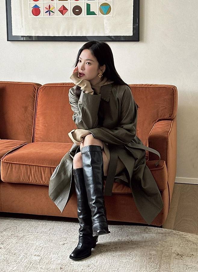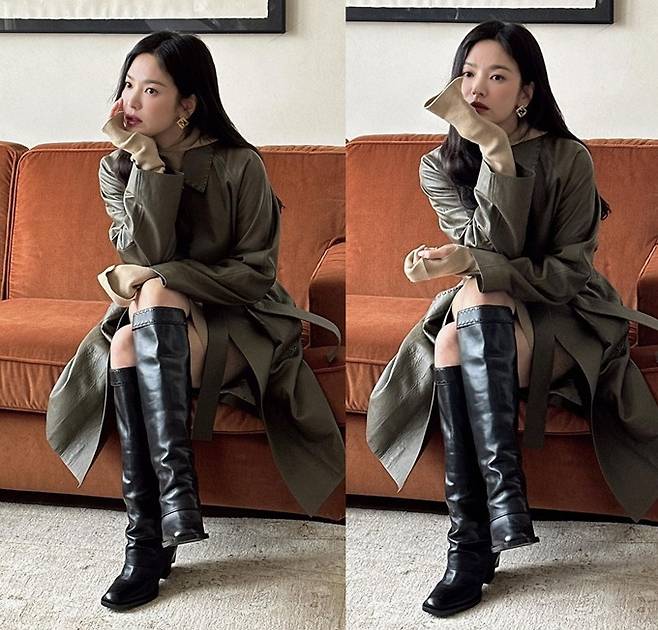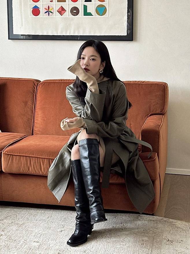 공개한 사진에서 송혜교는 쇼파에 앉아 턱을 괸 포즈로 브라운 벨티트 레더 트렌치코트를 입고 완벽한 가을 여자로 변신했다.
