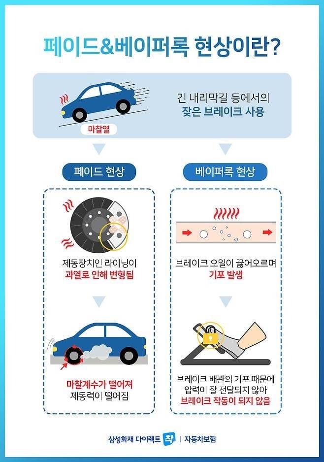 내리막길에서 브레이크 페달만 계속 밟으면 브레이크 패드와 디스크가 400도 이상 가열된다. 이때 발생하는 ‘페이드 현상’은 브레이크 성능을 50% 이상 저하시킨다. 급경사에서 브레이크가 먹통이 되는 순간, 대형 사고로 직결된다.