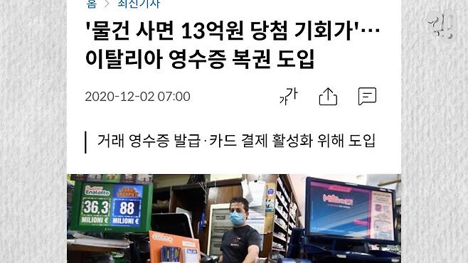 2020년에는 이탈리아 정부가 최고 당첨금이 무려 13억 원인 영수증 복권 제도를 도입해 탈세를 막겠다고 발표했는데, 과연 대만처럼 몇 십 년간 꾸준히 이어질 수 있을지, 아니면 우리나라처럼 역사 속으로 자취를 감추게 될지는 조금 더 지켜봐야 할 것 같다.