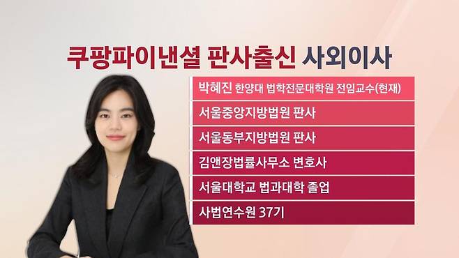 이번에 쿠팡파이낸셜 사외이사로 영입된 이는 박혜진 전 판사입니다.