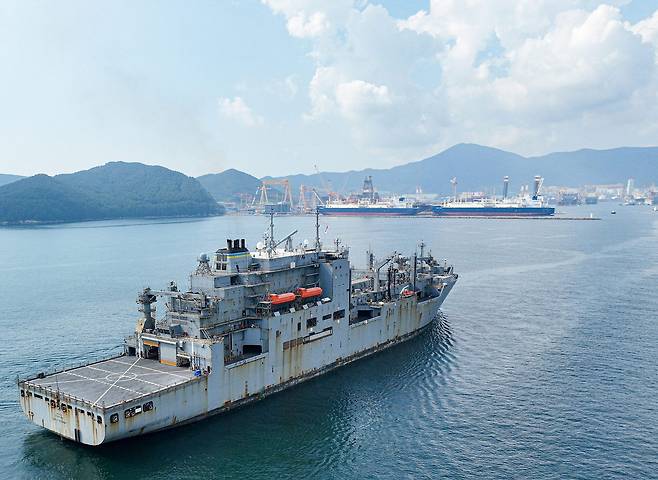 미국 해군 7함대 소속 화물보급함 ‘USNS 앨런 셰퍼드함’이 울산 염포부두에 입항했다. 배수량 4만1000t 규모의 이 함정은 길이 210m, 폭 32m, 높이 9.4m에 달하며, 군수물자 보급과 전투 지원 임무를 맡는 핵심 전력이다.