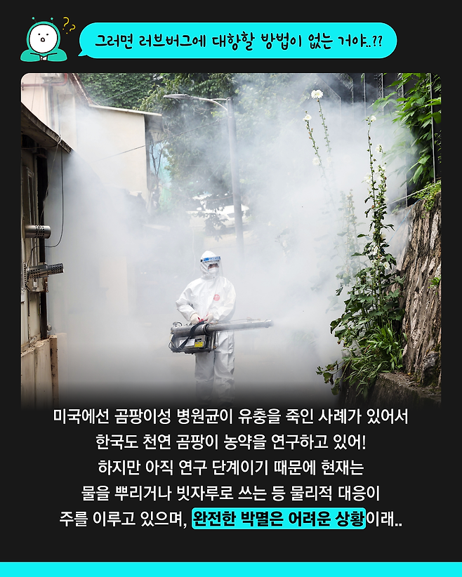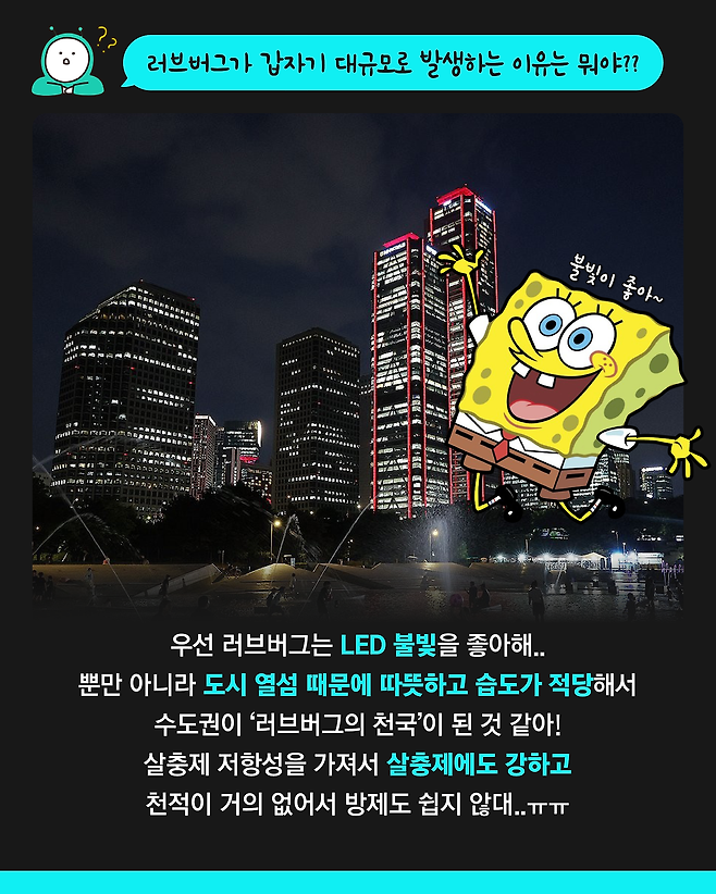 LED 불빛, 열섬현상, 살충제 저항성, 존재하지 않는 천적 등으로 인해 도시가 '러브버그 천국'이 되었고 방제도 쉽지 않습니다.
