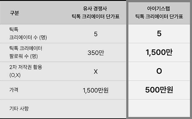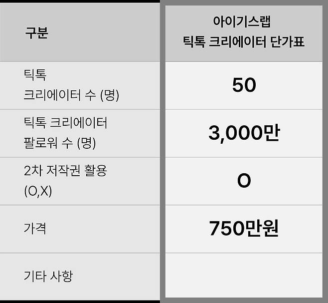 기존 틱톡 MCN은 1인당 5백만원 이상을 불렀지만… 아이기스랩은 도합 1,500만 팔로워 5명의 인플루언서를 500만원에 제공한다. 어지간하면 5명 중 1명은 추천 피드에 뜬다.
