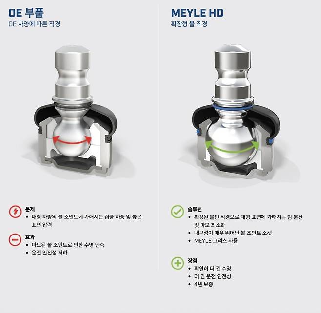 볼핀은 조향 시스템과 서스펜션에서 중요한 역할을 하는 부품입니다. 순정 볼핀은 하중과 압력에 취약하여 마모되기 쉽지만, 마일레 HD 볼핀은 볼 헤드의 직경을 키워 표면에 가해지는 힘을 분산시키고 마모를 최소화합니다. 이를 통해 부품의 수명을 연장하고 운전 안전성을 향상시킵니다.