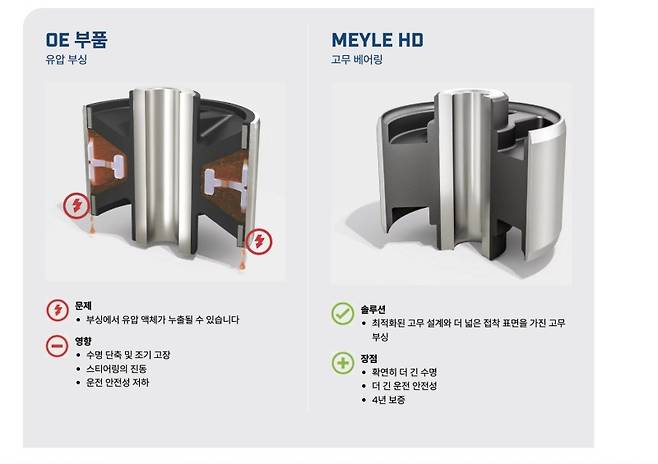 서스펜션 내 유압 부싱은 차량의 진동과 승차감에 큰 영향을 미칩니다. 순정 부싱은 외부 충격에 의해 오일 누유가 발생하기 쉽지만, 마일레 HD 고무 부싱은 특수 고무 재질과 강화된 결합 구조를 통해 내구성을 극대화했습니다. 고강도 주행 조건에서도 뛰어난 성능을 유지하며, 오랜 기간 검증된 기술력을 자랑합니다.