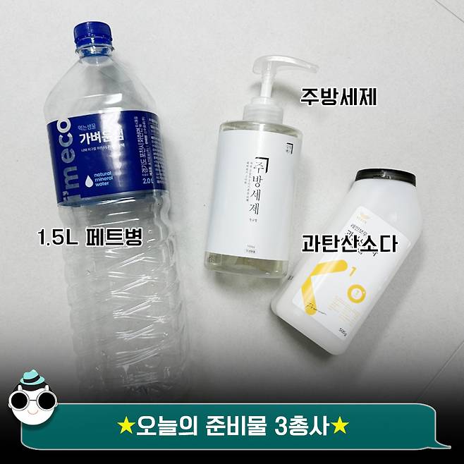 사이즈는 보통 생수 1.5L 정도면 딱이에요. 여기에 과탄산소다와 주방세제까지 있으면 준비 끝!