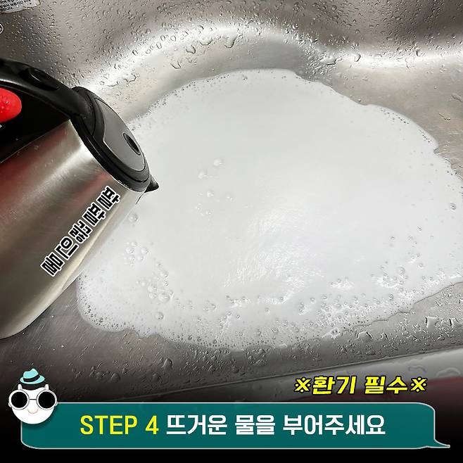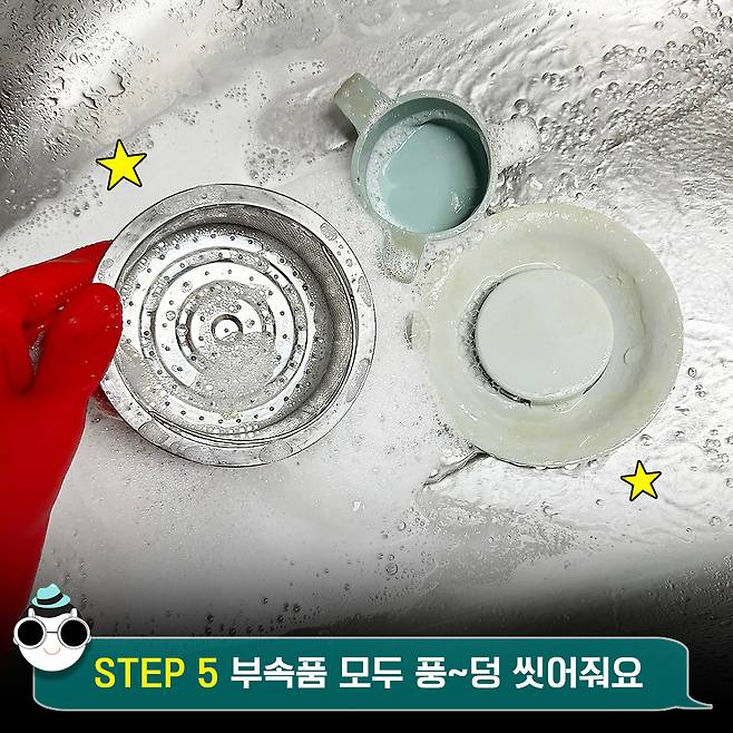 곧이어 싱크대를 가득 채우게 될텐데요. 이때 아까 제거한 싱크대 덮개나 거름망 같은 부속품을 거품에 퐁당 담아줄게요. 겸사겸사 같이 청소하는 거죠(!!!)