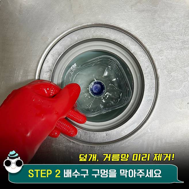STEP 2 싱크대 배수구 구멍을 막아주세요