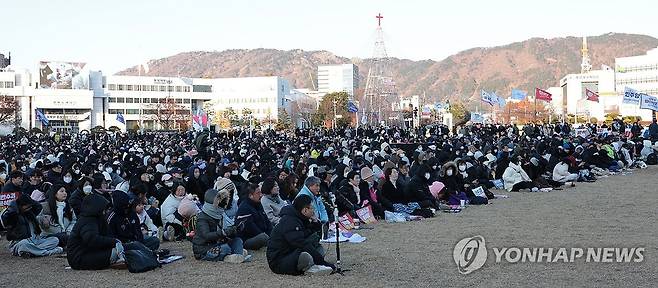 (창원=연합뉴스) 정종호 기자 = 14일 오후 경남 창원시 성산구 창원광장에서 열린 경남도민대회에 참가한 시민들이 국회 탄핵 표결 생중계를 지켜보고 있다. 2024.12.14