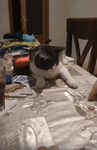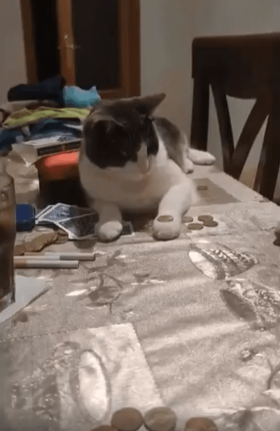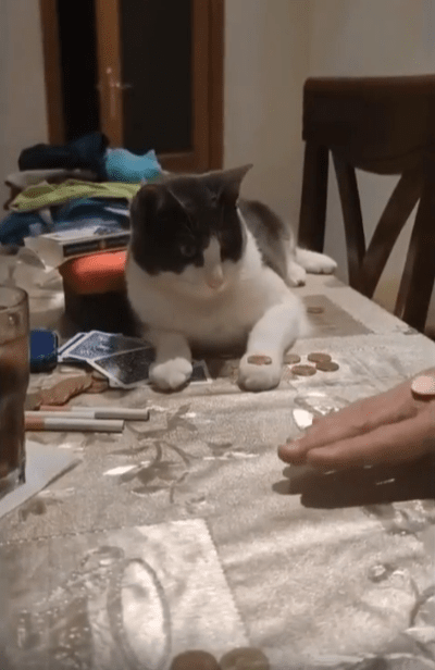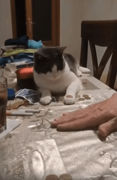 그런데 다음 순간, 모든 사람이 놀랄 일이 벌어집니다. 고양이는 앞발을 살짝 움찔하더니, 자기 발 위에 올려진 동전을 똑같이 튕겨올려 한 쪽 앞발로 툭 낚아챕니다. 그 동작은 어설프지 않았고, 의도된 듯 정확하며, 마치 “봐, 나도 할 수 있어”라고 말하는 듯한 표정이었습니다. 주인은 놀라고, 보는 이도 감탄합니다. 지금 고양이는 단순히 따라 한 것이 아니라, 완벽히 이해하고 흉내낸 것처럼 보였으니까요.