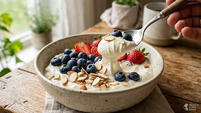 그릭 요거트는 일반 요거트를 만든 뒤 유청을 한 번 더 걸러내는 과정을 거친다. 이 과정에서 수분이 빠지고 단백질이 농축되기 때문에 같은 양이라도 일반 요거트보다 단백질이 훨씬 많다. 170g 기준으로 단백질이 약 14.9g 들어 있고, 단백질 함량이 높을수록 소화 속도가 느려 식사나 간식으로 먹은 뒤 배고픔이 늦게 찾아온다.