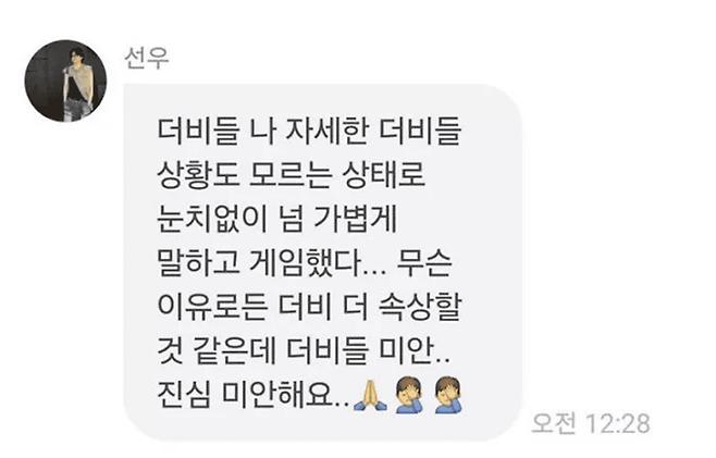 논란이 커지자 선우는 하루 뒤인 11일, 팬 플랫폼에 다시 사과문을 올렸습니다. 그는 "자세한 상황도 모른 채 눈치 없이 너무 가볍게 말하고 게임을 했다"며 "무슨 이유로든 더비가 더 속상할 것 같다. 진심으로 미안하다"고 전했습니다.