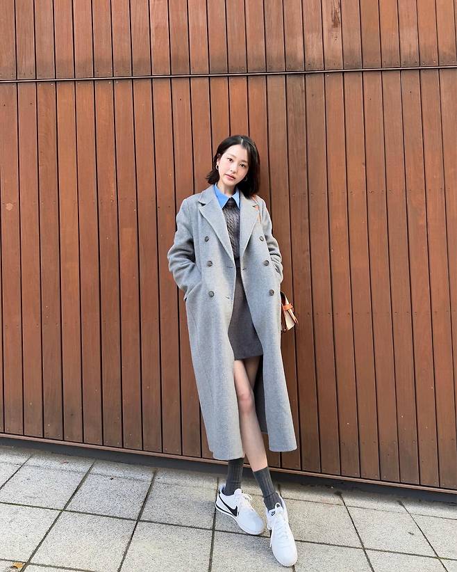 여기에 그레이 롱코트를 툭 걸치면 단정하면서도 센스 있는 스타일링 완성이에요.