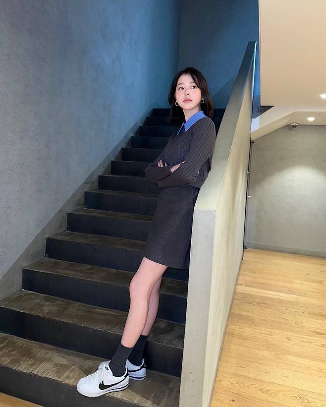 신발은 클래식한 코르테즈 스타일의 운동화를 선택해 캐주얼한 느낌을 더했고, 발목 양말로 깔끔한 마무리까지.