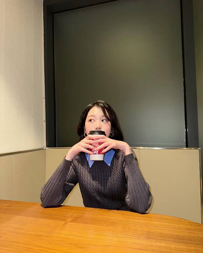 슬림한 핏의 케이블 니트는 촘촘한 짜임으로 단정함을 강조했고, 안에 입은 하늘빛 셔츠 칼라가 은근한 포인트가 되어 룩 전체를 한층 생기 있게 만들어줘요.